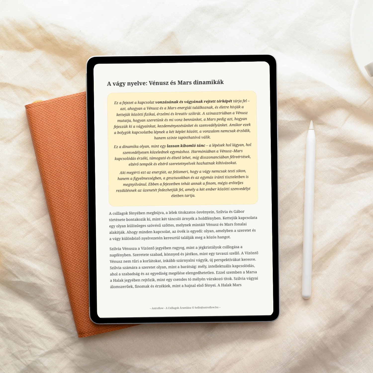Amint véglegesíted a rendelést, azonnal elkezdődik a varázslat. A születési adataitok alapján összeállítjuk a teljes Szinasztria elemzést – ez nem egy sablon, hanem egy kizárólag rólatok szóló, mintegy 40+ oldalas párkapcsolati elemzés.