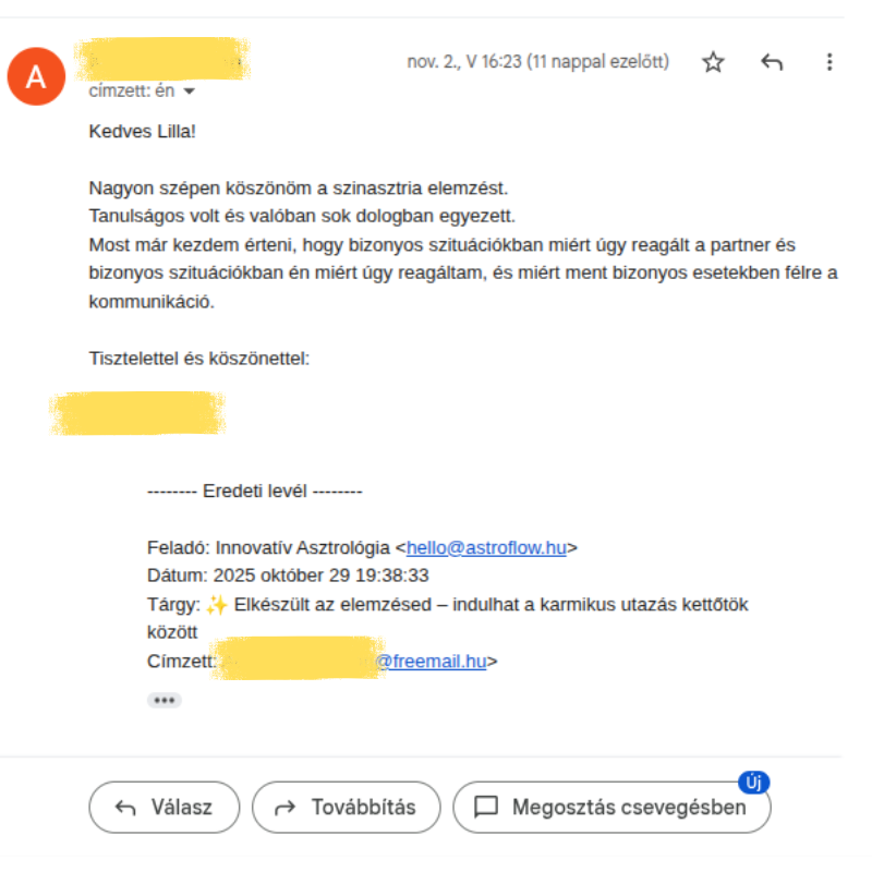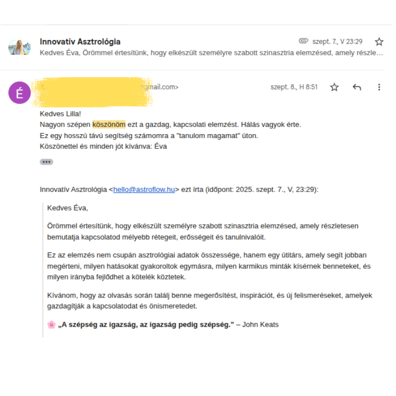 Ha szeretnéd megtapasztalni ugyanezt a tisztánlátást, rendeld meg a szinasztria elemzést, és engedd, hogy a képletek megmutassák kettőtök valódi történetét.